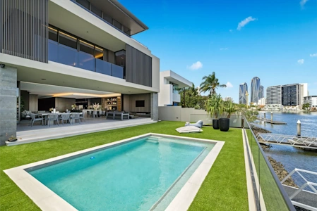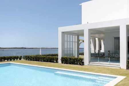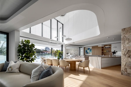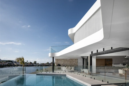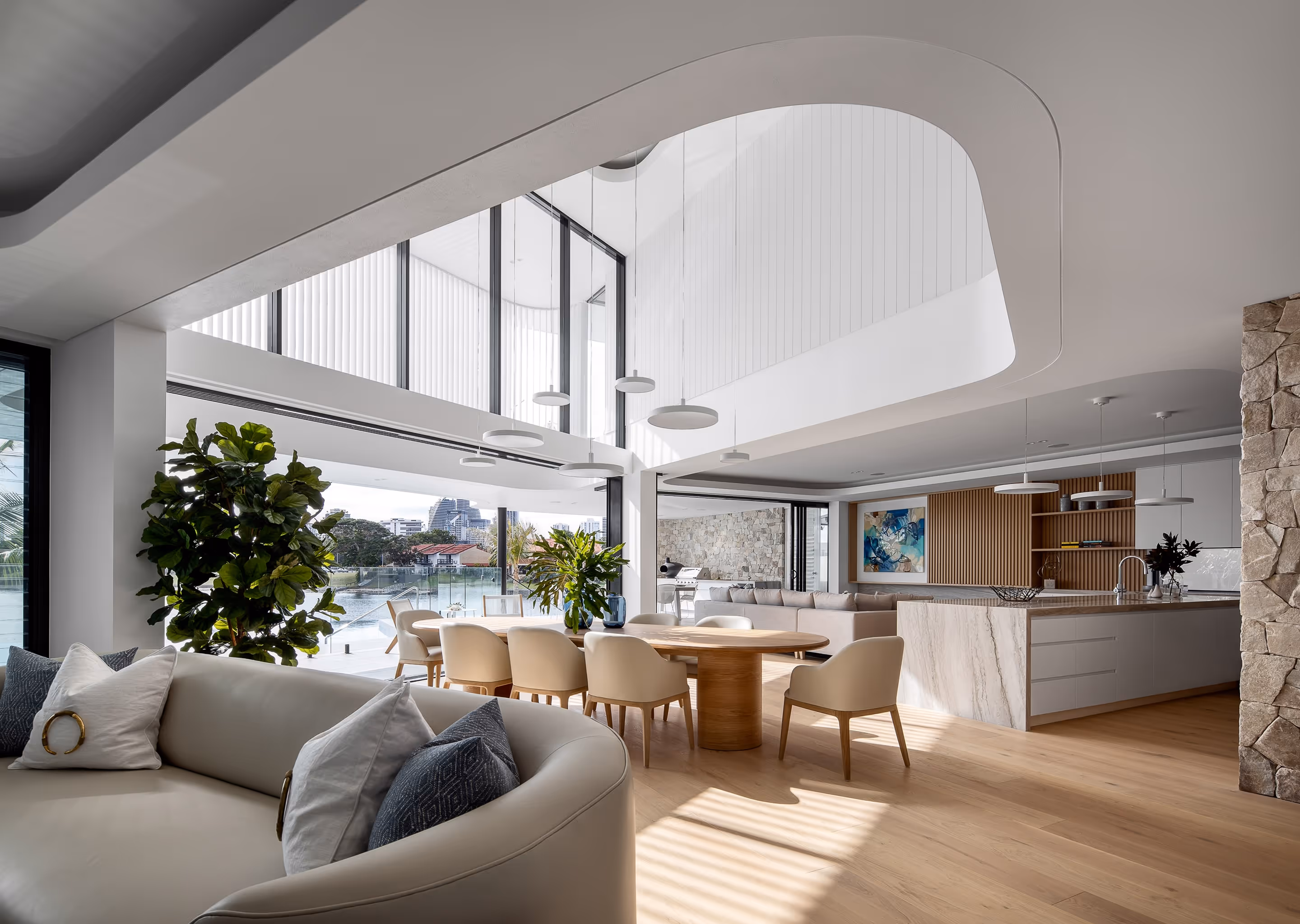 Designed to harmonise with its canal-front position, the residence embraces light, materiality, and spatial flow to create a serene yet striking retreat.
