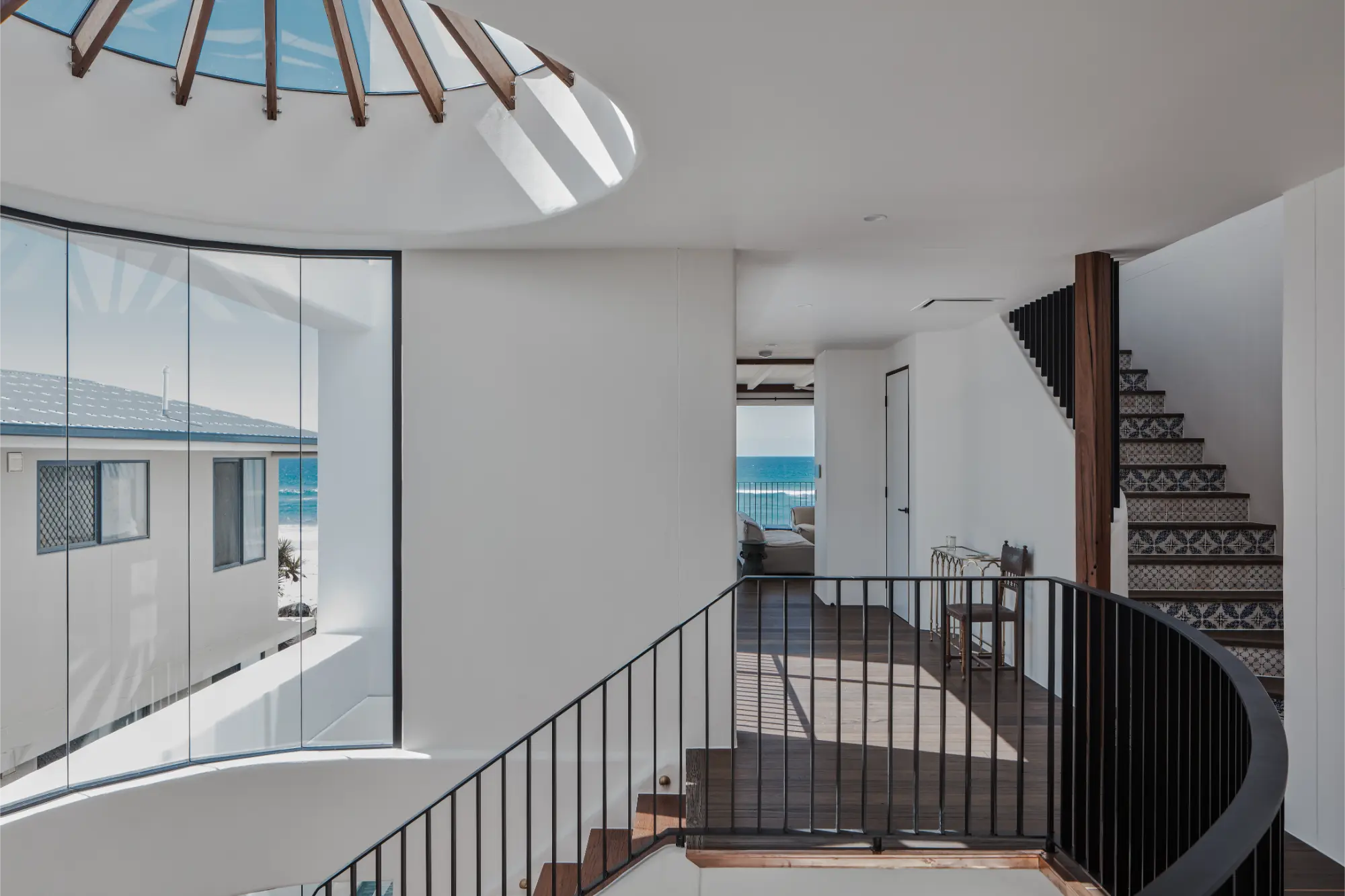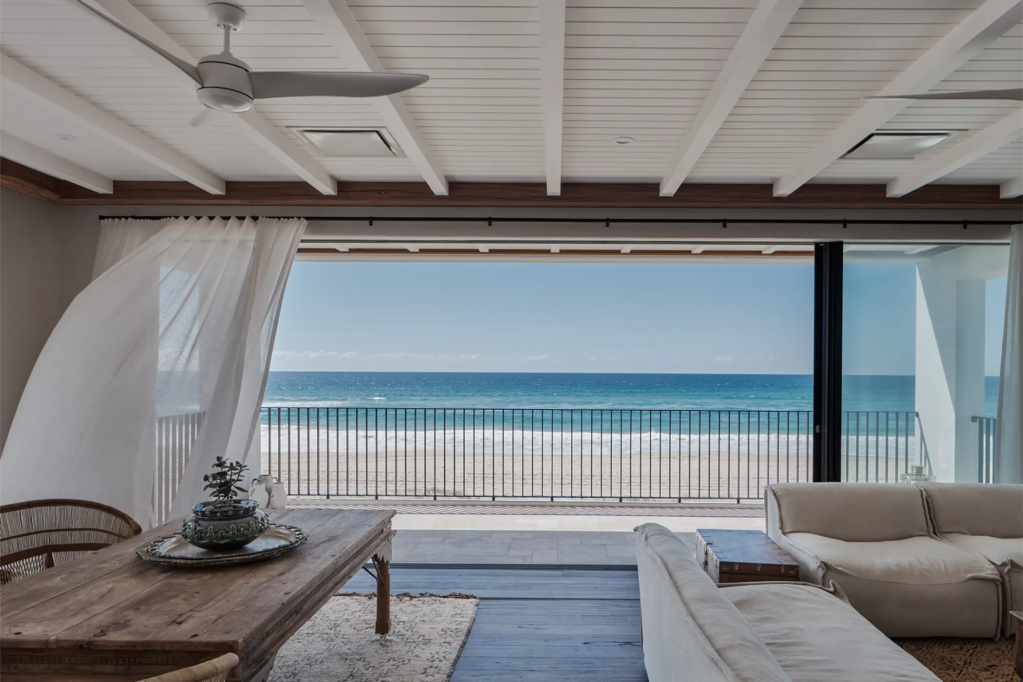 At its heart, a grand arched entrance welcomes you into an interior palette rich with depth, dark finishes balanced by the warmth of natural timbers, soft linens, and woven rattan. Recycled hardwood and crisp white render form the home’s foundation, while rustic tiles and patterned stone details enhance its distinctive character. Open-plan living invites a sense of flow, creating an atmosphere that is both sophisticated and effortlessly lived-in – an oasis where timeless design meets coastal serenity.