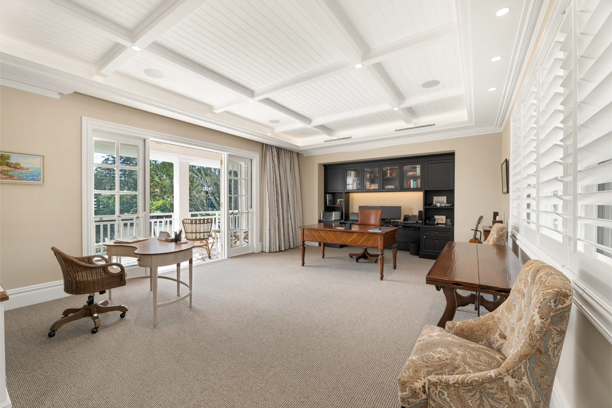 A stately entrance hall introduces the residence’s architectural narrative, with oval coved ceilings, extensive wall panelling, and a sense of procession that unfolds into spaces of crafted luxury. French doors, coffered ceilings, and timber flooring articulate the home’s connection to tradition, while bespoke finishes elevate every room. The granite-clad kitchen and Sub-Zero-equipped butler’s pantry offer understated sophistication, while the stone fireplace anchors the sunlit family room with warmth and texture.
