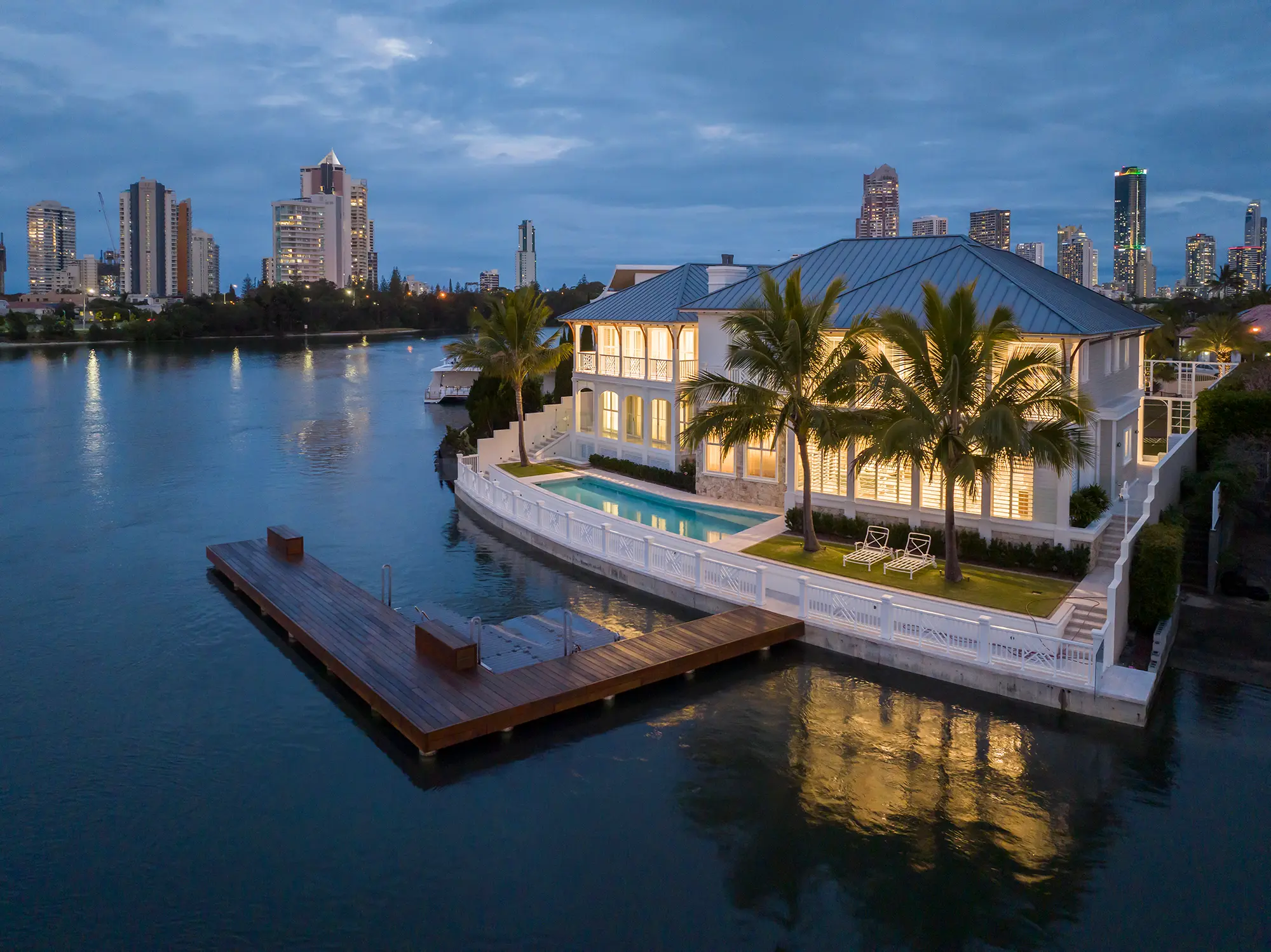 Perched on a commanding northern point in Paradise Waters, Northpoint 703 is a testament to architectural excellence by Jared Poole Design. This residence seamlessly blends coastal elegance with modern luxury, drawing inspiration from Bahamian and Hamptons styles. Its luminous façade, especially striking at dusk, complements the serene Gold Coast waterways, creating a harmonious balance between built form and natural beauty.